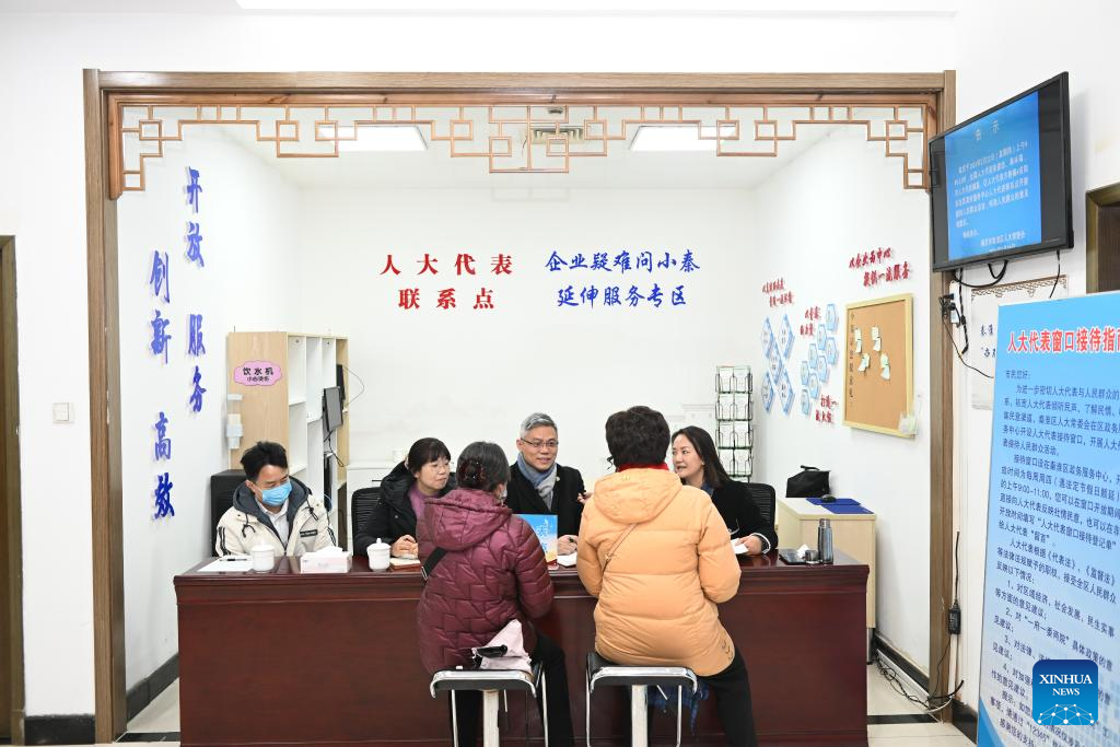 Zhang Junjie (2nd L) communicates with residents at a local legislators' liaison station in Qinhuai District of Nanjing, east China's Jiangsu Province, Feb. 22, 2024. (Xinhua/Ji Chunpeng)