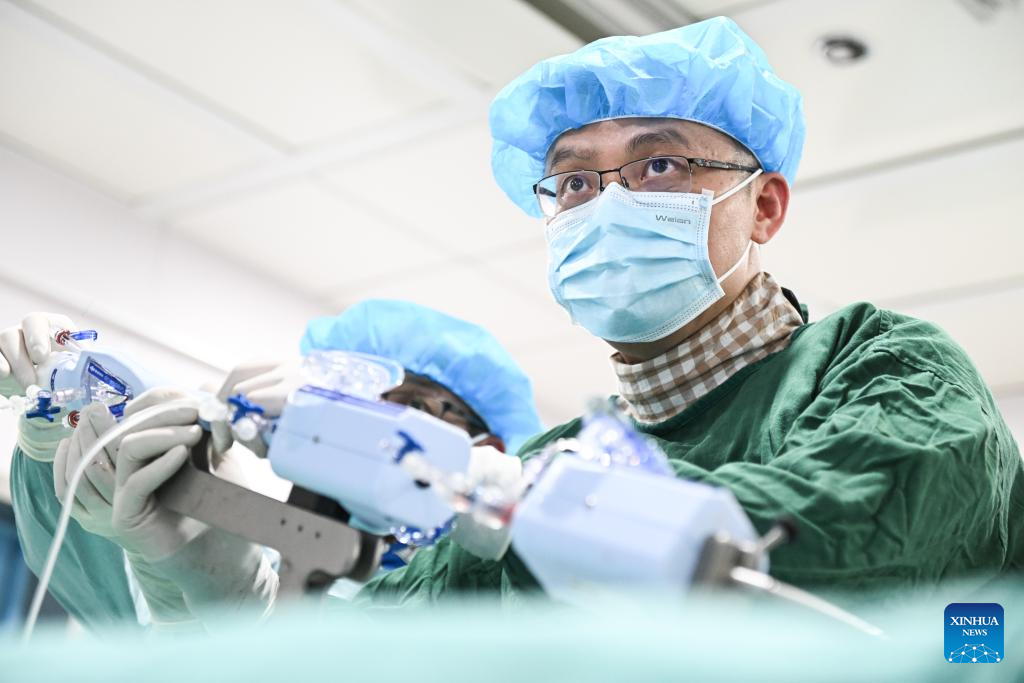 Zhang Junjie (R) and his colleague perform surgery on a patient at the Nanjing First Hospital in Nanjing, east China's Jiangsu Province, Feb. 20, 2024. (Xinhua/Ji Chunpeng)