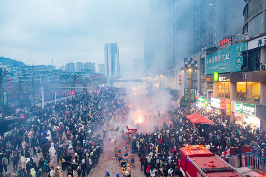 A time-honored tradition of the local Tujia ethnic group, the celebration takes place every year during the Lantern Festival. During the event, dragon dance teams brave the streets while spectators hurl firecrackers and fireworks at them. This exhilarating event creates a lively spectacle, earning the event its nickname, "Oriental Carnival." In 2021, this unique tradition was added to the expanded list of state-level intangible cultural heritage items.
