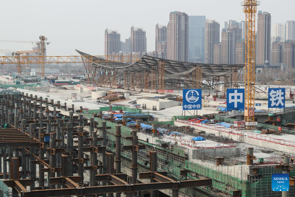 This photo taken on Feb. 27, 2024 shows the construction site of the integrated transportation hub at the Beijing Sub-center Station in Tongzhou District, sub-center of Beijing, capital of China. At present, the construction of the integrated transportation hub, which is located at the core area of Beijing's sub-center Tongzhou District, is proceeding smoothly. (Xinhua/Shan Yuqi)