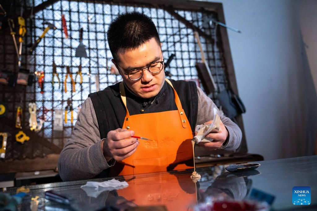 Hao Guanxiong makes an artwork at his studio in Changsha, central China's Hunan Province, Feb. 28. 2024. (Xinhua/Chen Sihan)