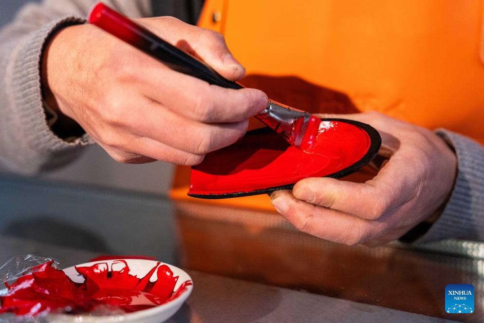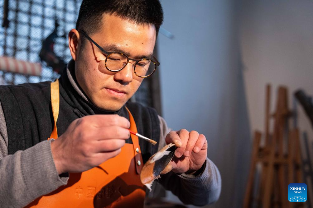 Hao Guanxiong paints lacquer on a semi-finished artwork at his studio in Changsha, central China's Hunan Province, Feb. 28. 2024. (Xinhua/Chen Sihan)