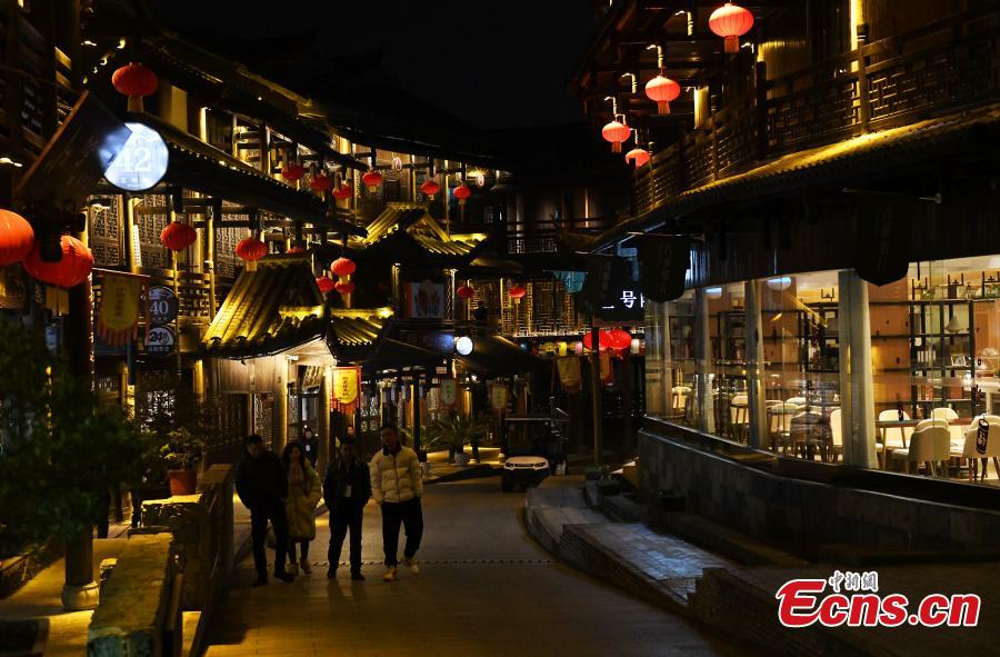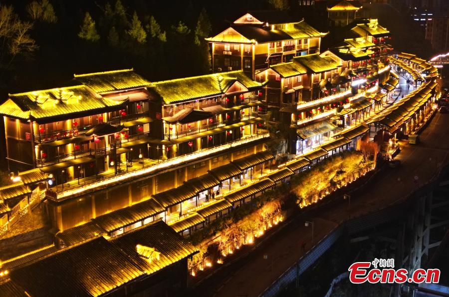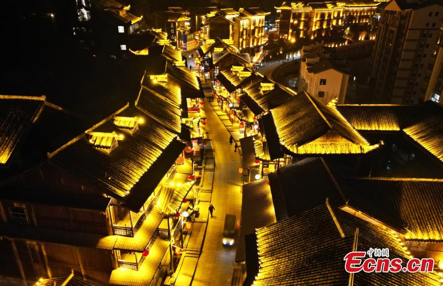 Youzhou ancient town is lit up at night, creating a dream-like scenery in Youyang Tujia and Miao Autonomous County, Chongqing, Feb. 29, 2024. (Photo: China News Service/Zhou Yi)