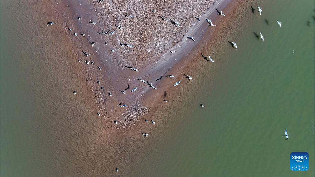 An aerial drone photo taken on March 1, 2024 shows migratory birds flying over the tidal-flat area at a section of the Yellow River in northwest China's Ningxia Hui Autonomous Region. With the temperature rising, the ice in Ningxia section of the Yellow River has been gradually melting. Flocks of migratory birds fly over the tidal-flat area and the turquoise water, adding a touch of vitality to the spring scenery. (Xinhua/Wang Peng)
