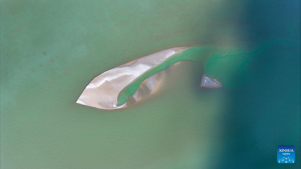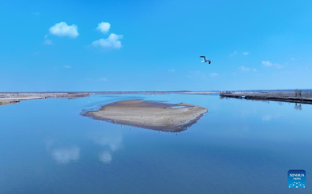 An aerial drone photo taken on March 1, 2024 shows the scenery at a section of the Yellow River in northwest China's Ningxia Hui Autonomous Region. With the temperature rising, the ice in Ningxia section of the Yellow River has been gradually melting. Flocks of migratory birds fly over the tidal-flat area and the turquoise water, adding a touch of vitality to the spring scenery. (Xinhua/Wang Peng)