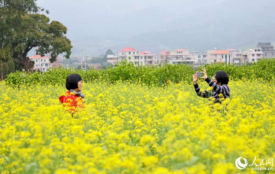 Tourists have fun at a rapeseed field in Shanchong village, Changtai district, Zhangzhou city, southeast China's Fujian Province. (People's Daily Online/Li Changqian)