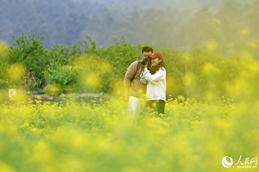A tourist takes pictures of her companion at a rapeseed field in Shanchong village, Changtai district, Zhangzhou city, southeast China's Fujian Province. (People's Daily Online/Li Changqian)