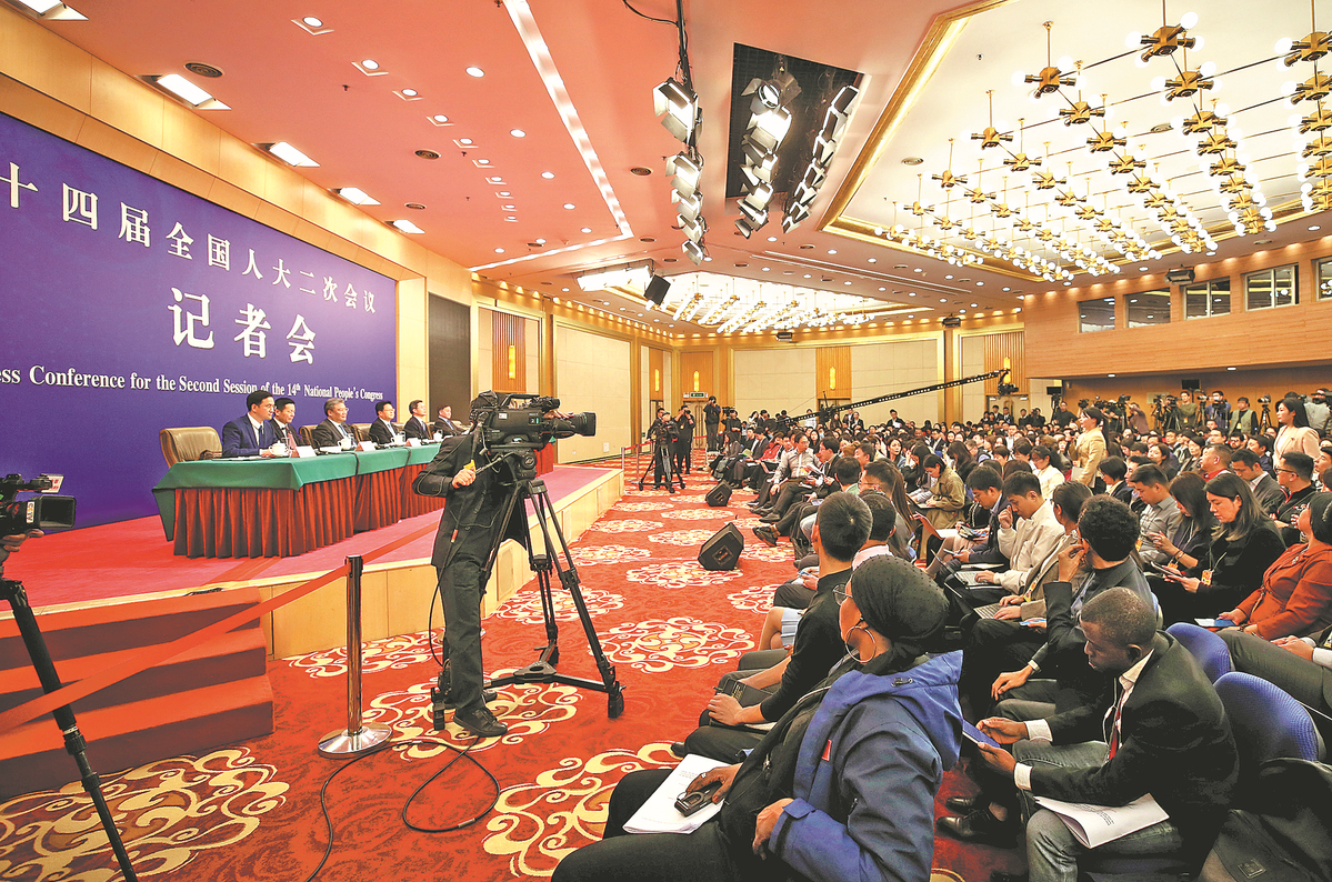 A news conference on issues such as development and reform, the fiscal budget, commerce, finance and securities is held in Beijing on Wednesday on the sidelines of the second session of the 14th National People's Congress. ZHANG WEI/CHINA DAILY