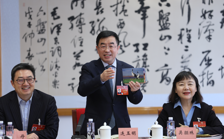 Lian Yuming, center, a member of the 14th National Committee of the Chinese People's Political Consultative Conference and president of the Beijing-based International Institute for Urban Development, speaks at a panel discussion on the Government Work Report on March 6, 2024. [Photo by Zou Hong/chinadaily.com.cn]