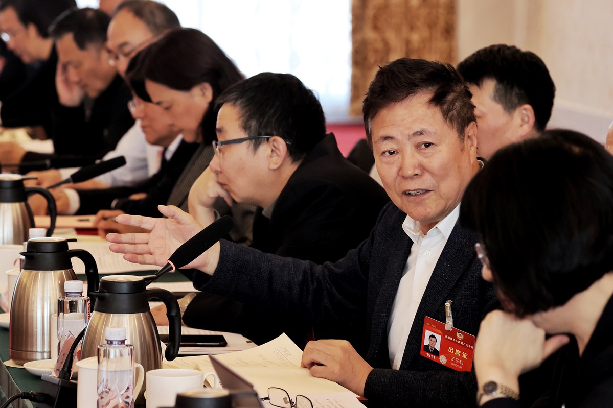 Ding Guanghong, center, a member of the 14th National Committee of the Chinese People's Political Consultative Conference, speaks at a panel discussion on the Government Work Report on March 6, 2024. [Photo by Jiang Dong/chinadaily.com.cn]