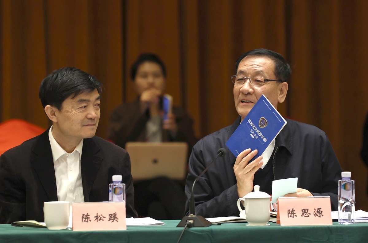 Zhong Zhangdui, left, a member of the 14th National Committee of the Chinese People's Political Consultative Conference and professor at Beijing Jiaotong University, speaks at a panel discussion on the Government Work Report on March 6, 2024. [Photo by Zou Hong/chinadaily.com.cn]