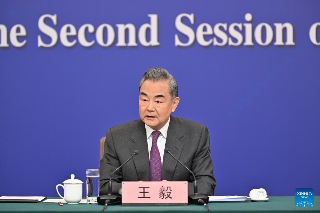 Chinese Foreign Minister Wang Yi, also a member of the Political Bureau of the Communist Party of China Central Committee, attends a press conference on China's foreign policy and foreign relations on the sidelines of the second session of the 14th National People's Congress (NPC) in Beijing, capital of China, March 7, 2024. (Xinhua/Cai Yang)