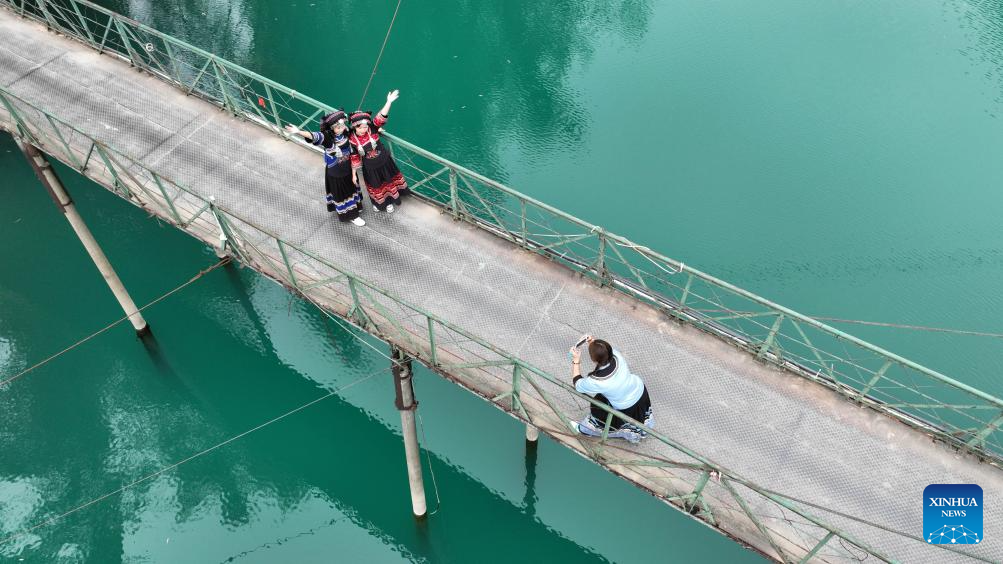 An aerial drone photo taken on March 7, 2024 shows visitors taking photos at Daxiaojing scenic spot in Luodian County, southwest China's Guizhou Province. (Xinhua/Yang Ying)