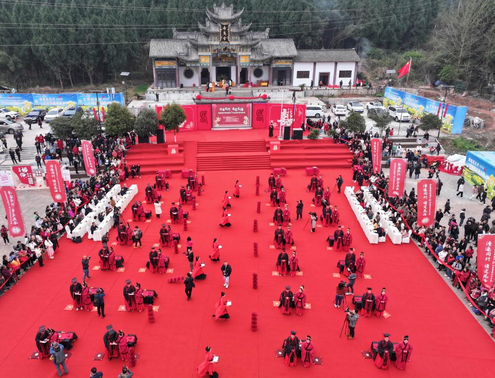 A drone photo taken on March 9, 2024 shows couples dressed in traditional costumes taking part in a group wedding in Tongnan District of Chongqing, southwest China. (Xinhua/Wang Quanchao)