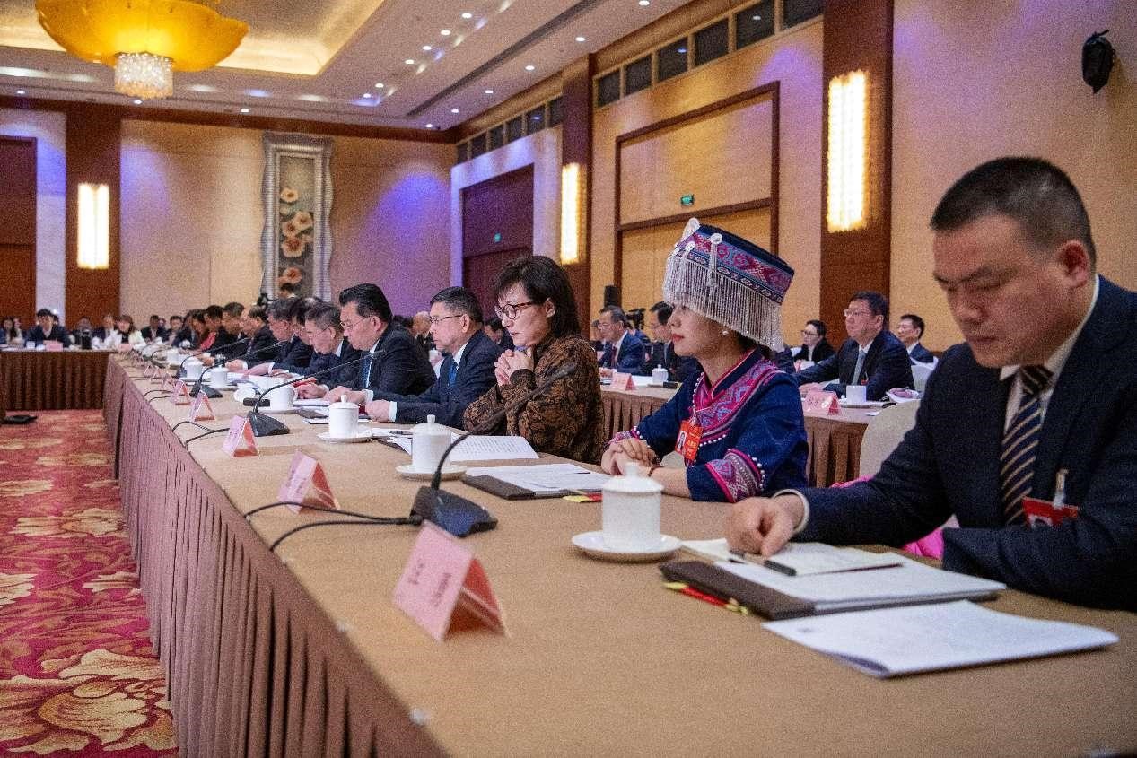 At a group meeting of the Hubei province delegation during the second session of the 14th National People's Congress, deputies review the government work report, March 5, 2024. (People's Daily Online/Weng Qiyu)