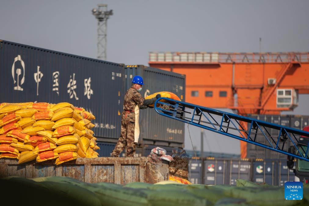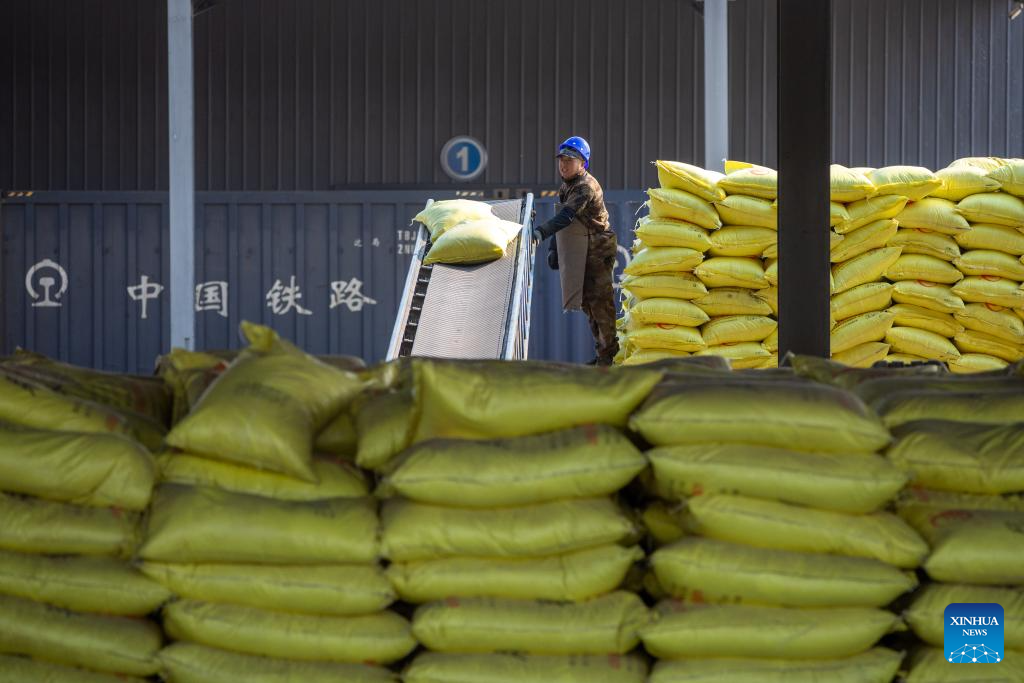 A worker carries chemical fertilizer at the freight yard of Zhaodong Station, Daqing depot of China Railway Harbin Bureau Group Co., Ltd., northeast China's Heilongjiang Province, March 13, 2024. As spring farming activities is about to start in Heilongjiang, a major grain producing province, China Railway Harbin Bureau Group Co., Ltd. has established a regular contact mechanism involving local fertilizer dealers, with more than 500,000 tonnes of fertilizer transported since the beginning of 2024. (Xinhua/Zhang Tao)