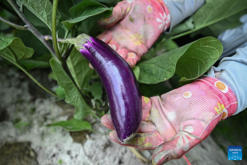 This photo taken on March 15, 2024 shows an eggplant in a greenhouse at Wangtangnan Village of Wengtian Town in Wenchang City, south China's Hainan Province. (Xinhua/Pu Xiaoxu)