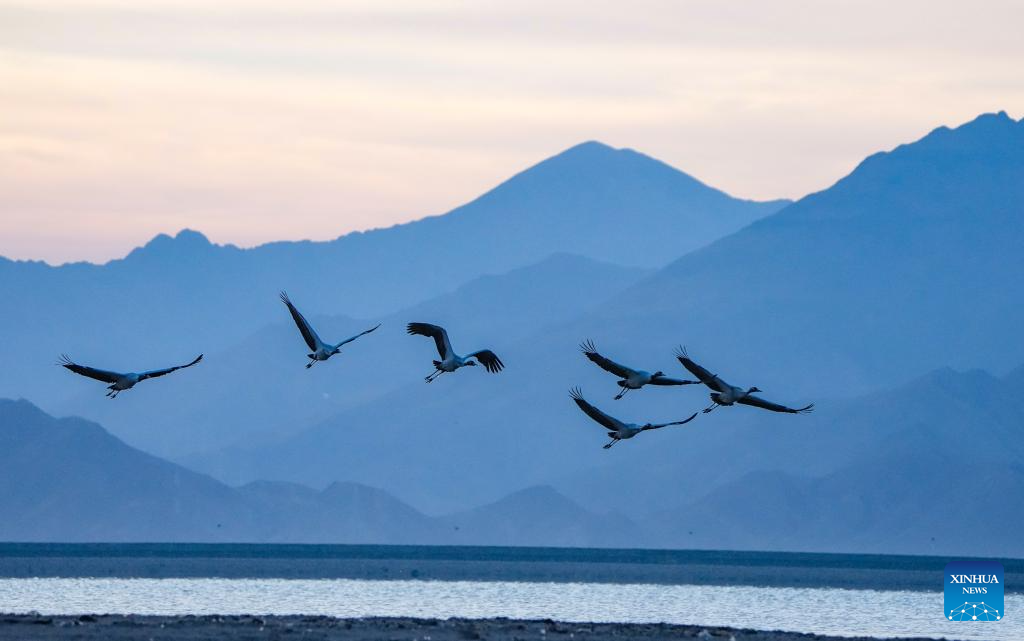 Black-necked cranes are seen at a reservoir in Lhunzhub County of Lhasa, southwest China's Xizang Autonomous Region, March 17, 2024. As the temperature gradually rises, black-necked cranes have started their migration from the reservoir in Lhunzhub County. The black-necked crane, a species under first-class state protection in China, mainly inhabits plateau meadows and marshes at an altitude of 2,500 to 5,000 meters. (Xinhua/Jigme Dorje)