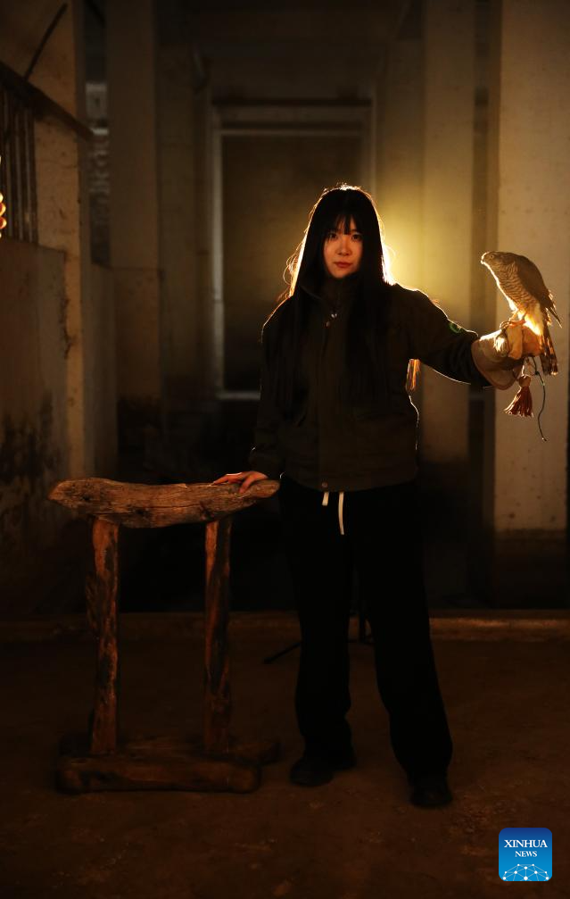 Meng Die poses for a photo with a sparrow hawk she rescued at Shenyang Raptor Rescue Center in Shenyang, northeast China's Liaoning Province, March 23, 2024. (Xinhua/Yang Qing)