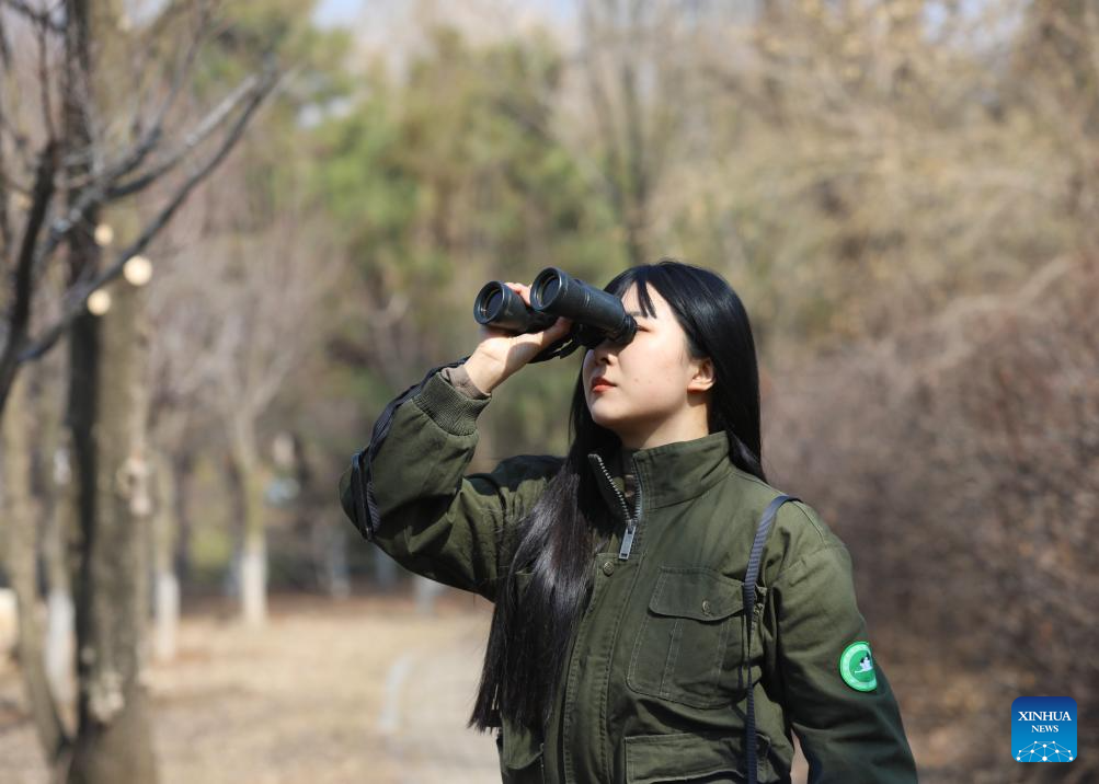 Meng Die takes records of wild birds in Shenyang, northeast China's Liaoning Province, March 23, 2024. (Xinhua/Yang Qing)