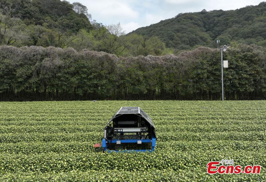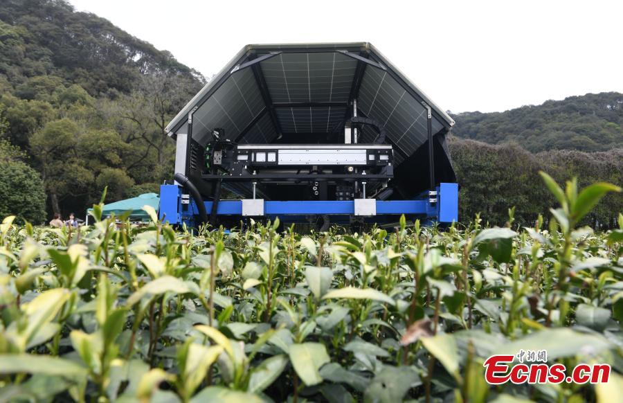 The AI tea picking robot was put into use in a tea garden. With a sun hat made of solar panels, a tea-picking robot weaved through rows of Longjing tea bushes in Hangzhou.