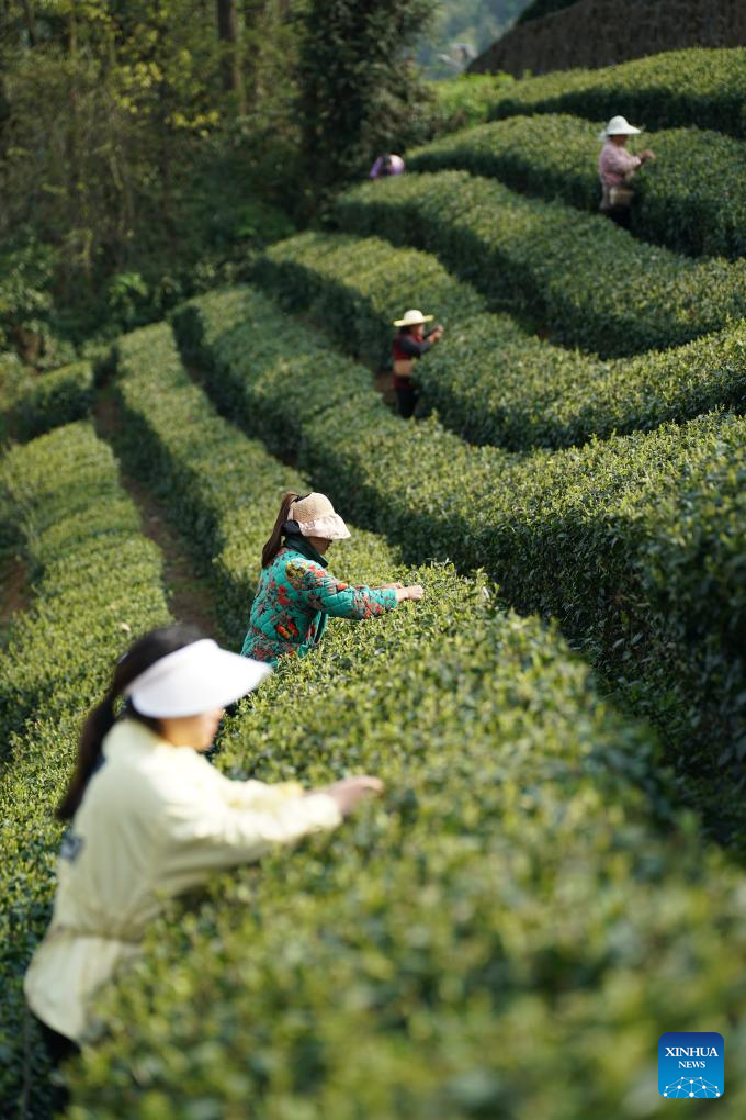 Farmers pick tea leaves at tea gardens in Ninghong Village in Xiushui County, east China's Jiangxi Province, March 28, 2024. Tea farmers and enterprises are busy harvesting and processing spring tea leaves to meet the consumer demand lately. (Xinhua/Wan Xiang)