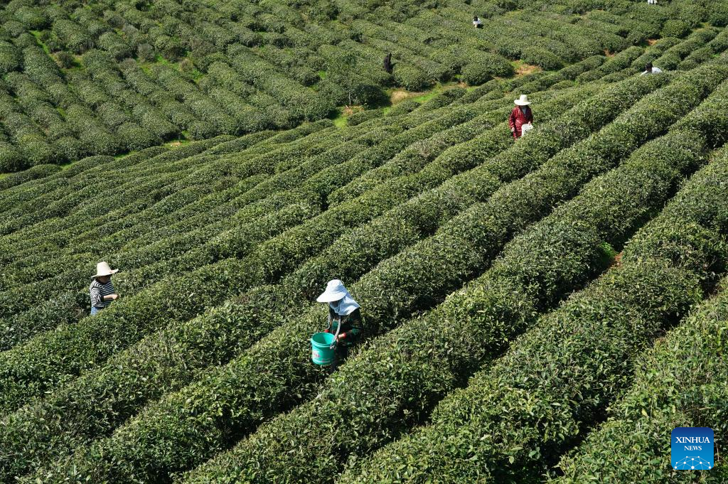 A drone photo shows farmers picking tea leaves at a tea garden in Fuxi Township in Huangshan City, east China's Anhui Province, March 28, 2024. Tea farmers and enterprises are busy harvesting and processing spring tea leaves to meet the consumer demand lately. (Xinhua/Huang Bohan)