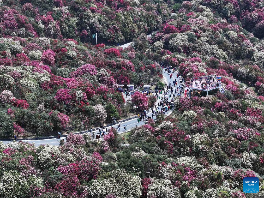 An aerial drone photo taken on March 29, 2024 shows tourists visiting the Bijie Baili Azalea scenic area in Bijie, southwest China's Guizhou Province. The warm weather and blooming flowers are attracting people out of their homes to enjoy the spring. (Photo by Chen He/Xinhua)
