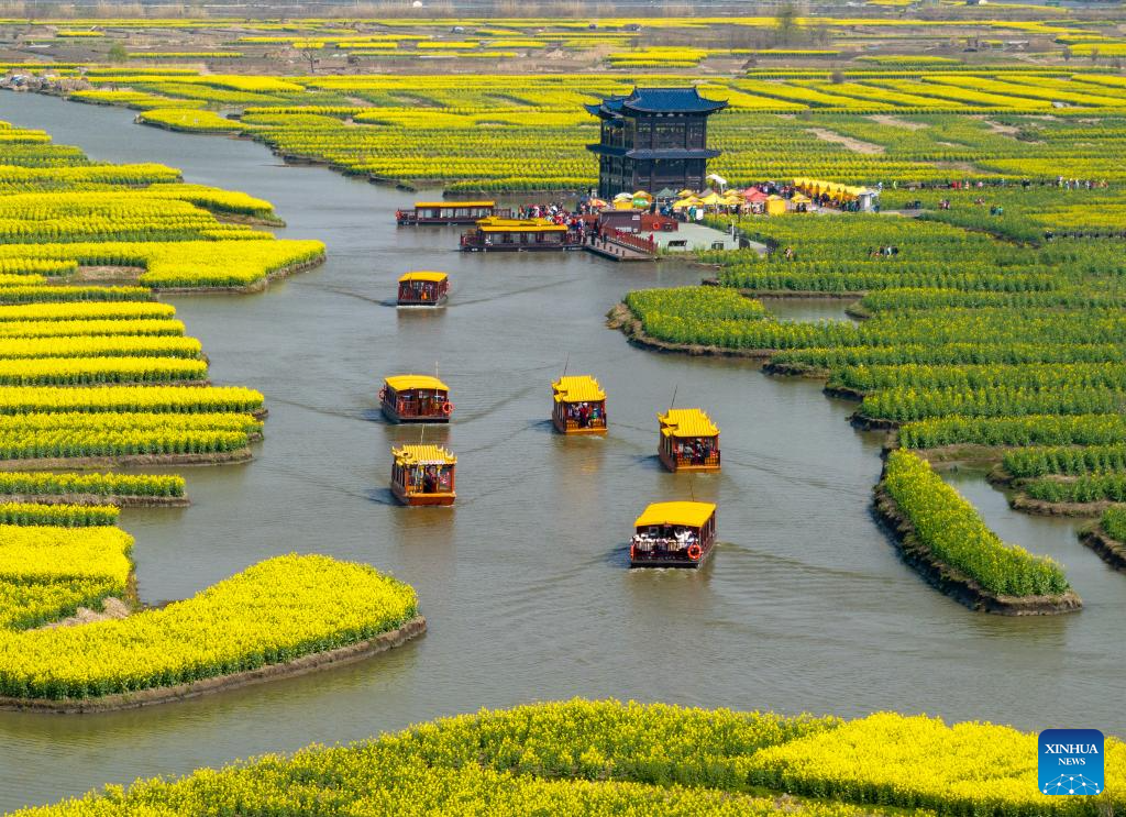 An aerial drone photo taken on March 29, 2024 shows tourists enjoying boat tours at a scenic area in Xinghua, east China's Jiangsu Province. The warm weather and blooming flowers are attracting people out of their homes to enjoy the spring. (Photo by Zhou Shegen/Xinhua)