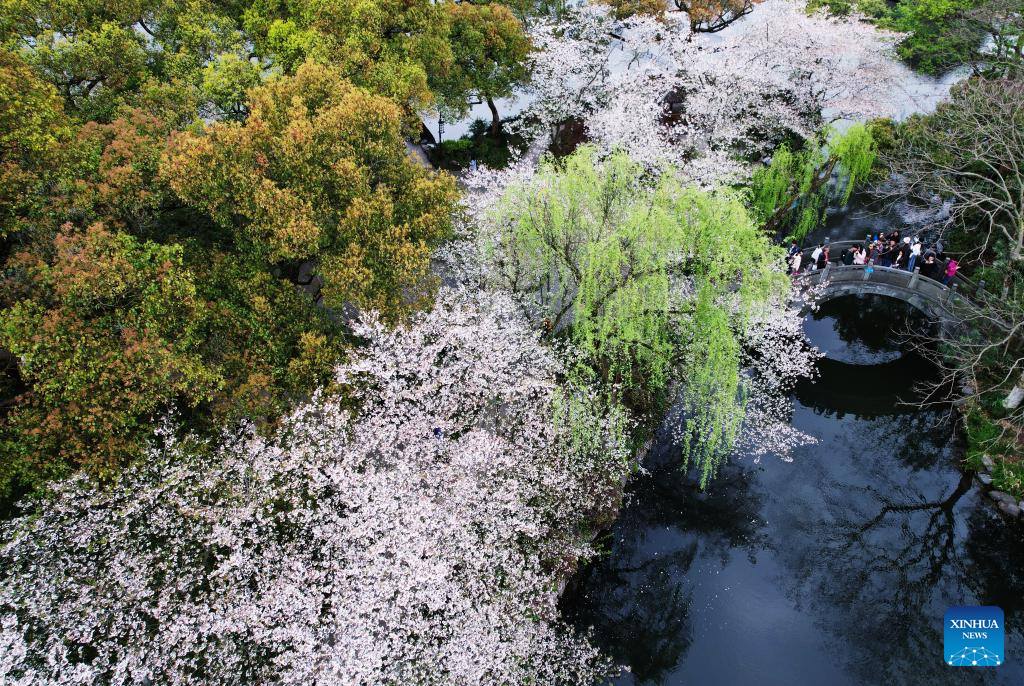 An aerial drone photo taken on March 29, 2024 shows cherry blossoms in Yangzhou, east China's Jiangsu Province. The warm weather and blooming flowers are attracting people out of their homes to enjoy the spring. (Photo by Meng Delong/Xinhua)