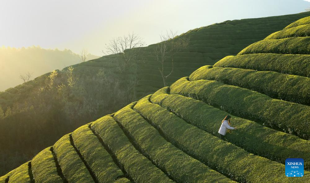 A farmer picks tea leaves at a tea garden in Zouma Town of Hefeng County, central China's Hubei Province, March 29, 2024. The county of Hefeng has made efforts in the coordinated development of tea planting and tourism industries to boost rural revitalization. (Photo by Yang Shunpi/Xinhua)