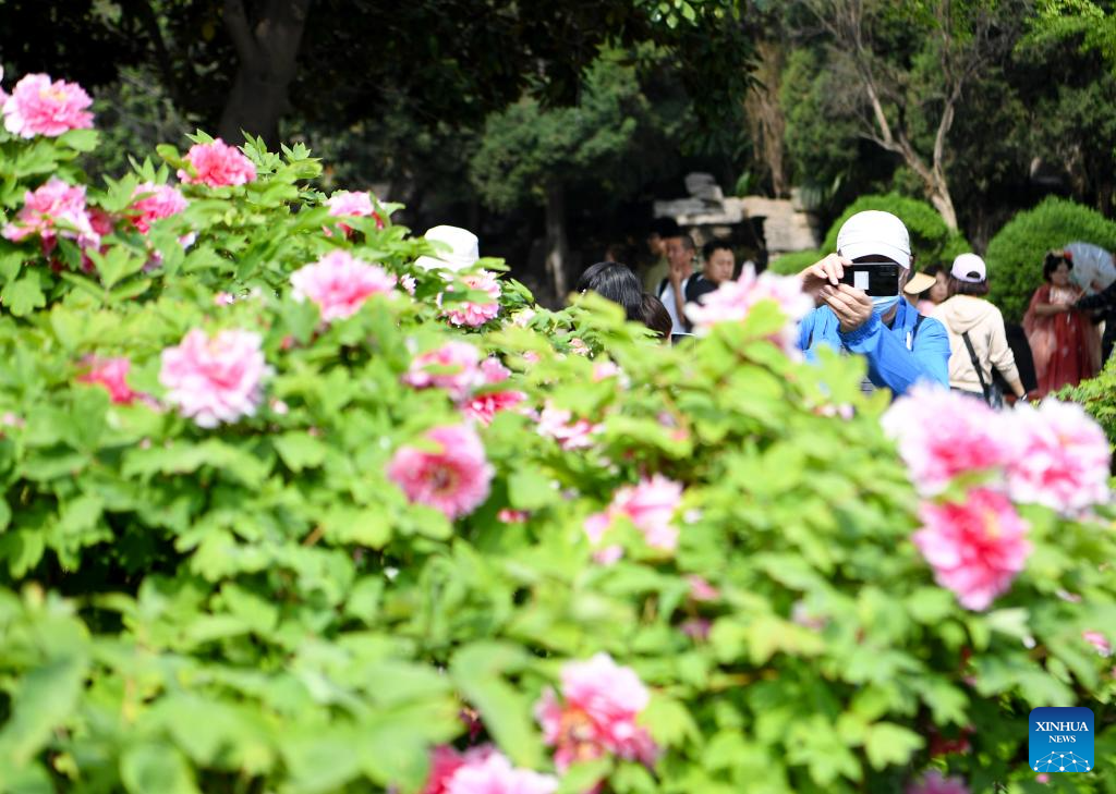 Tourists enjoy blossoming peony flowers in Luoyang, C China's Henan