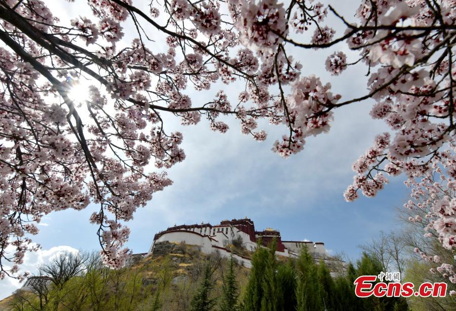 Potala Palace is surrounded by blooming flowers in Lhasa, Southwest China's Xizang Autonomous Region, April 6, 2024. (Photo: China News Service/Li Lin)