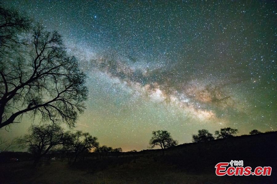 Night view of trees against the starry night with the Milky Way galaxy over a sand field in Xilingol League, north China's Inner Mongolia Autonomous Region. (Photo: China News Service/Guan Yongxin)