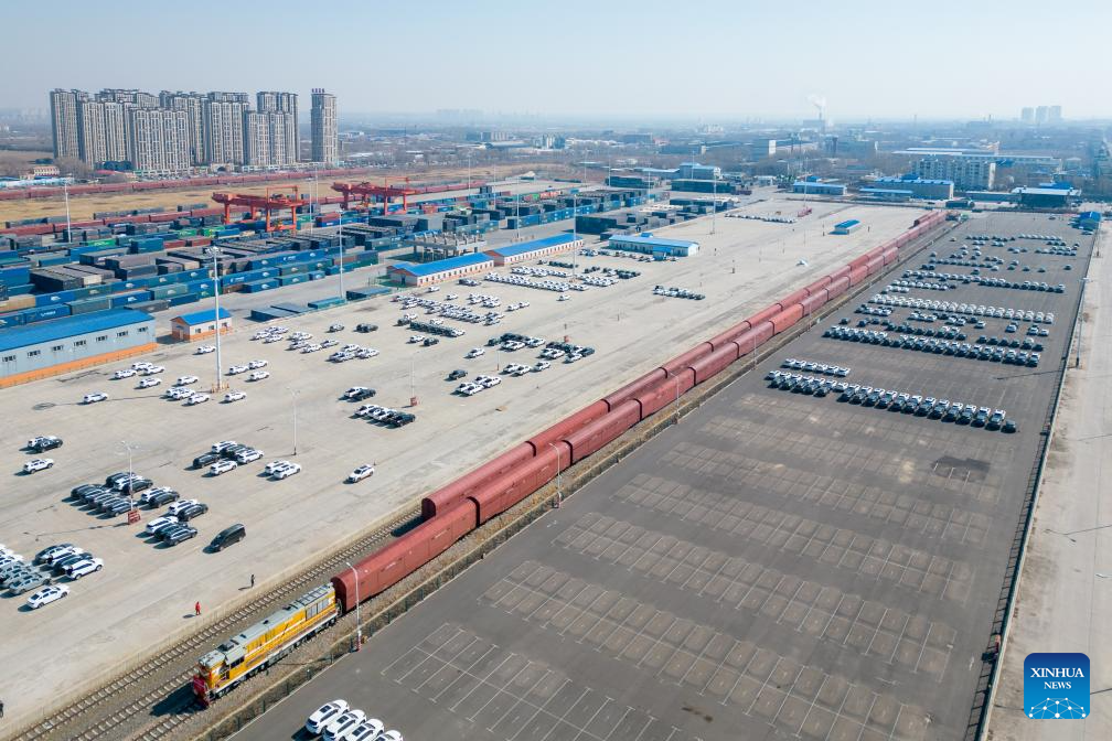 Staff members load vehicles onto a JSQ freight train at Harbin international container center station in Harbin, capital of northeast China's Heilongjiang Province, April 8, 2024. The first JSQ freight train from Harbin to Europe, which is loaded with 290 domestic commercial vehicles from China, departed on Tuesday. The JSQ is a special train model dedicated to the transportation of automobiles. (Xinhua/Zhang Tao)