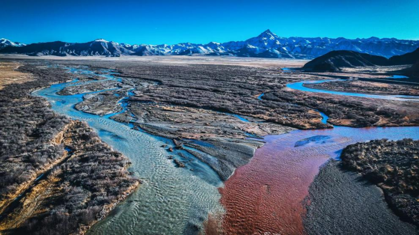 The convergence of the two rivers in Xiangjia township, Dulan county creates a distinct landscape, as the two rivers look entirely different when viewed from above.
