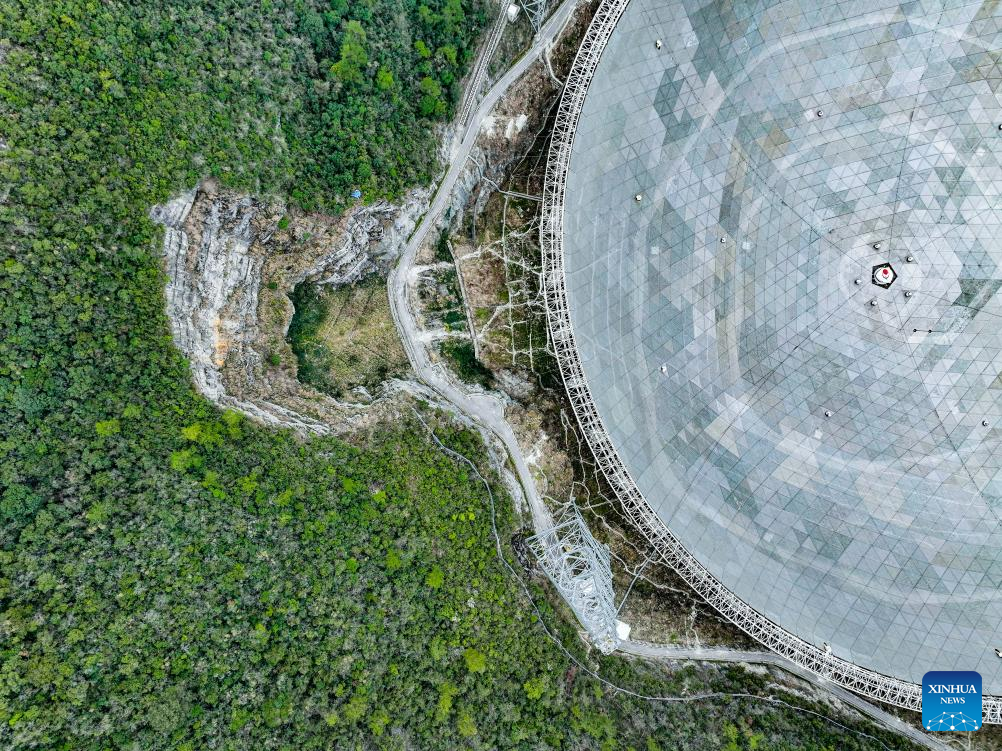 A drone photo taken on Feb. 26, 2024 shows China's Five-hundred-meter Aperture Spherical Radio Telescope (FAST) under maintenance in southwest China's Guizhou Province. China's Five-hundred-meter Aperture Spherical Radio Telescope (FAST), the world's largest single-dish radio telescope, has identified more than 900 new pulsars since its launch in 2016, its operator said Wednesday. (Xinhua/Ou Dongqu)