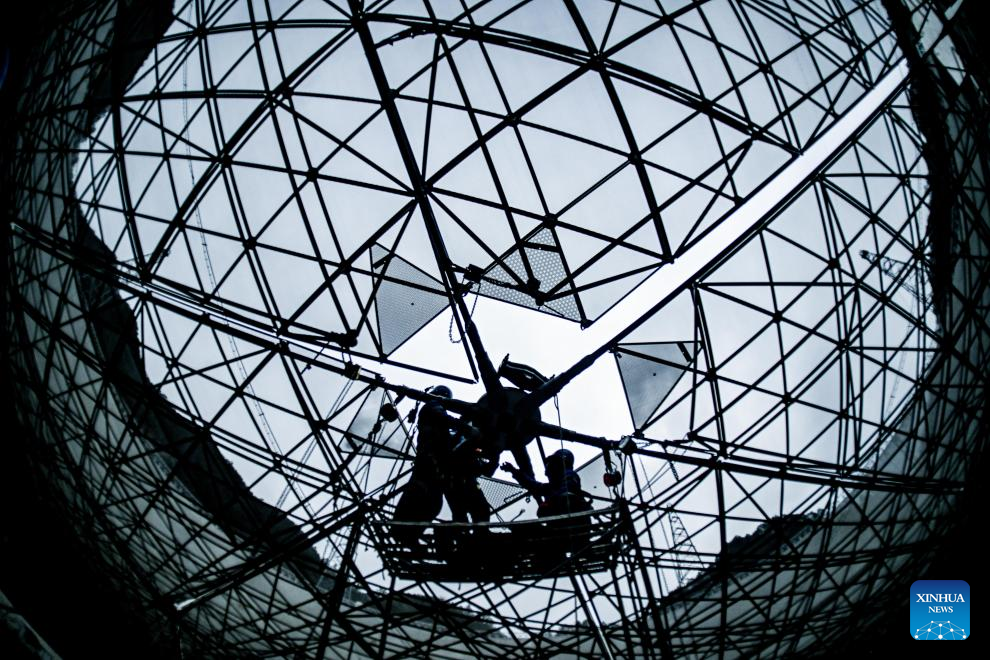 This photo taken on Feb. 26, 2024 shows China's Five-hundred-meter Aperture Spherical Radio Telescope (FAST) under maintenance in southwest China's Guizhou Province. China's Five-hundred-meter Aperture Spherical Radio Telescope (FAST), the world's largest single-dish radio telescope, has identified more than 900 new pulsars since its launch in 2016, its operator said Wednesday. (Xinhua/Ou Dongqu)