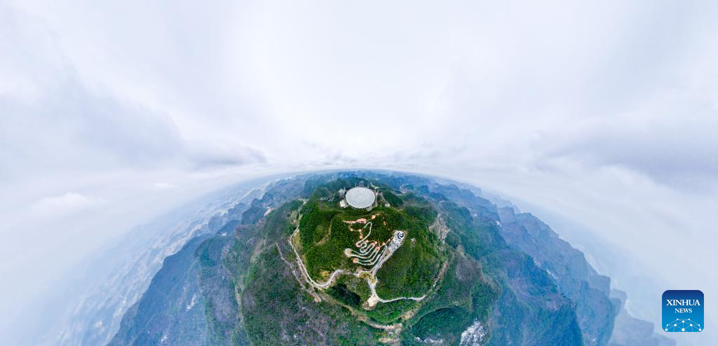 A drone panoramic photo taken on Feb. 27, 2024 shows China's Five-hundred-meter Aperture Spherical Radio Telescope (FAST) under maintenance in southwest China's Guizhou Province. China's Five-hundred-meter Aperture Spherical Radio Telescope (FAST), the world's largest single-dish radio telescope, has identified more than 900 new pulsars since its launch in 2016, its operator said Wednesday. (Xinhua/Ou Dongqu)