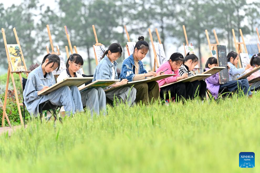 Children work on paintings by a field in Yuxin Town of Nanhu District, Jiaxing City, east China's Zhejiang Province, April 27, 2024. (Photo by Li Hanchi/Xinhua)