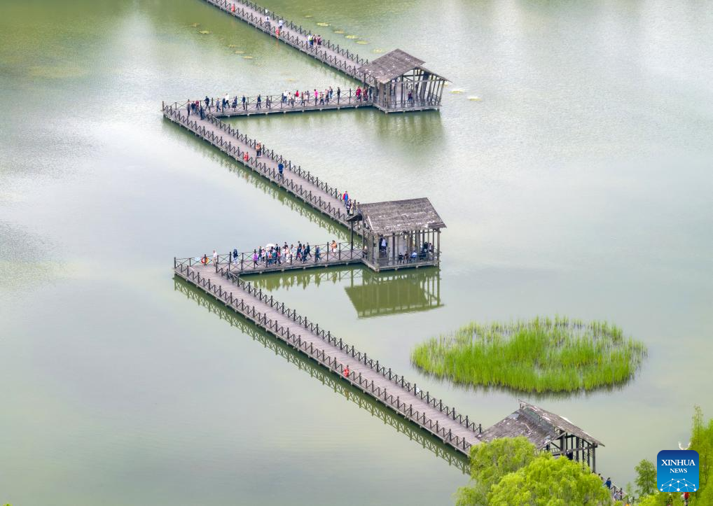 An aerial drone photo taken on April 27, 2024 shows tourists visiting Qinhu National Wetland Park in Jiangyan District of Taizhou, east China's Jiangsu Province. (Photo by Zhou Shegen/Xinhua)