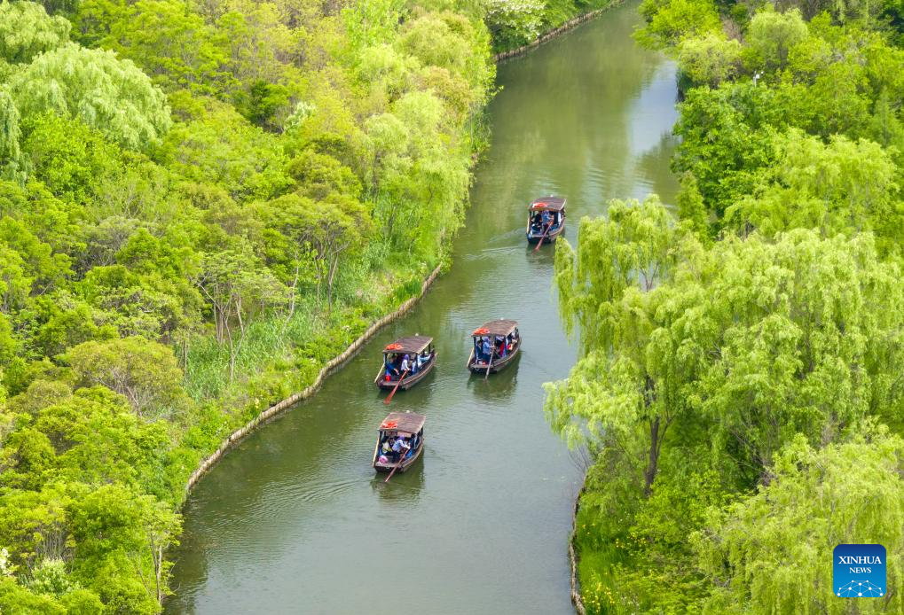 An aerial drone photo taken on April 27, 2024 shows tourists taking boats for sightseeing at Qinhu National Wetland Park in Jiangyan District of Taizhou, east China's Jiangsu Province. (Photo by Zhou Shegen/Xinhua)