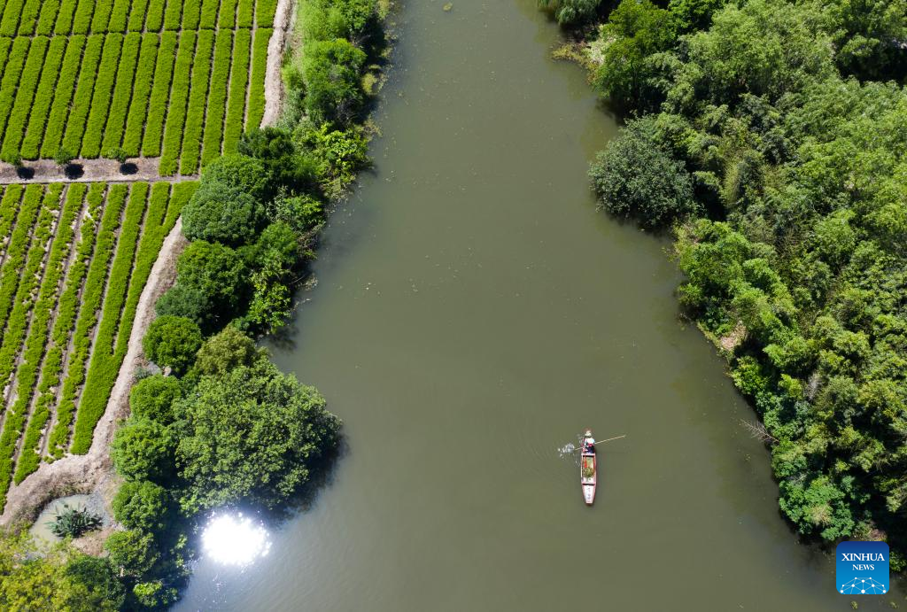 An aerial drone photo taken on May 16, 2024 shows a worker collecting floating objects on a boat at the Baita Lake national wetland park in Zhuji City, east China's Zhejiang Province. In recent years, Baita Lake national wetland park has implemented ecological restoration projects to improve the wetland ecological environment and promote the harmonious co-existence between man and nature. (Xinhua/Xu Yu)