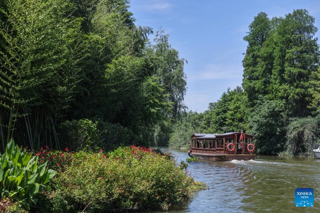 Visitors take a boat tour at the Baita Lake national wetland park in Zhuji City, east China's Zhejiang Province, May 16, 2024. In recent years, Baita Lake national wetland park has implemented ecological restoration projects to improve the wetland ecological environment and promote the harmonious co-existence between man and nature. (Xinhua/Xu Yu)