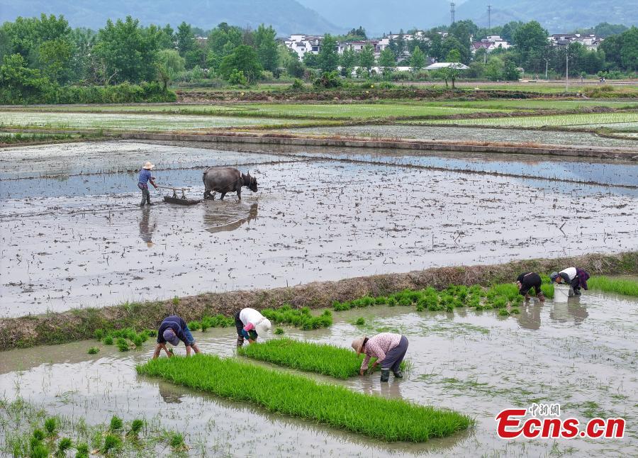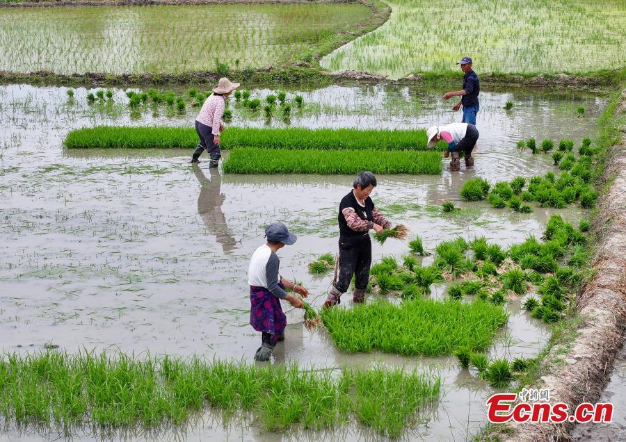 Villagers work on a rice field ahead of the traditional Chinese solar term Xiaoman (grain buds) which falls on May 20 this year. (Photo: China News Service/Shi Yalei)