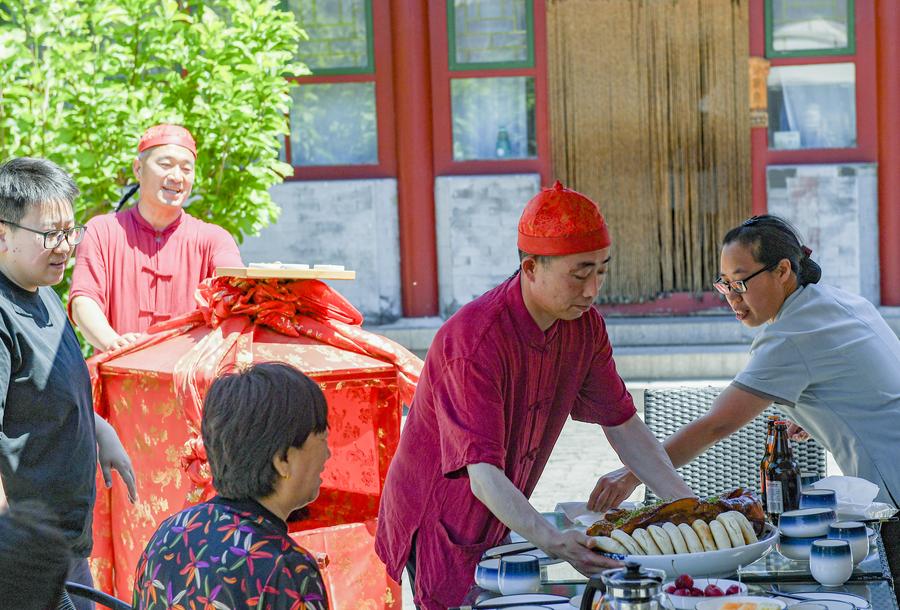 Waiters serve local delicacy to customers in Shixia Village in Yanqing District of Beijing, capital of China, June 1, 2024. (Xinhua/Chen Zhonghao)