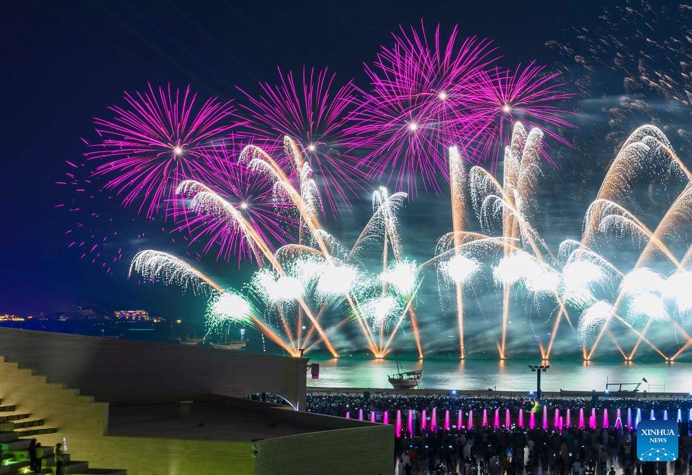 Fireworks light up the sky over Katara Cultural Village during celebrations of the Eid al-Adha in Doha, Qatar, June 16, 2024. (Photo by Nikku/Xinhua)