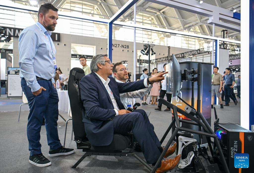 A visitor experiences simulated flying of aircraft at the low-altitude economy exhibition area at the World Intelligence Expo 2024 in north China's Tianjin, June 20, 2024. The World Intelligence Expo 2024, with the theme of "Intelligence: Extensive Development Space, Sustainable Growth Driver," opened on Thursday in north China's Tianjin, and exhibition of low-altitude economy has won much attention.