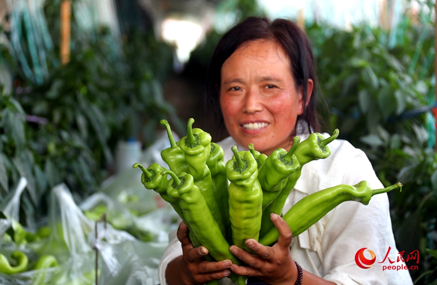 A farmer showcases freshly harvested chili peppers at a vegetable plantation in Wangdaifu village, Shawo township, Qixian county, Kaifeng city, central China's Henan Province. (People's Daily Online/Huo Yaping)