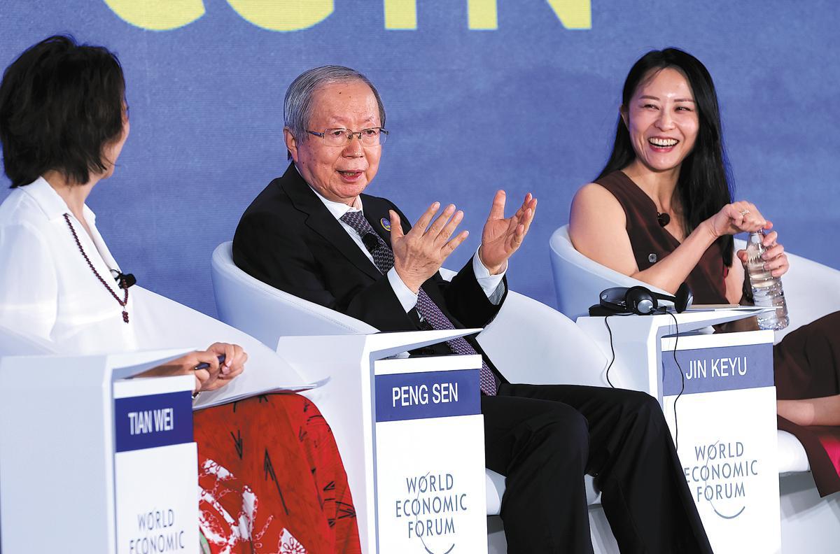 Peng Sen (center), president of the China Society of Economic Reform, speaks on Thursday at a subforum themed on China's economic outlook at the 15th Annual Meeting of the New Champions in Dalian, Liaoning province. (ZOU HONG/CHINA DAILY)